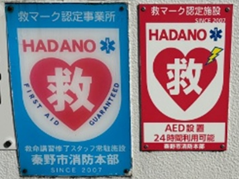 また、秦野市の救命認定施設(救マーク)として登録されており、心肺停止した方への早期救命処置のため、事業所外の方もAEDが利用できるようにしています。