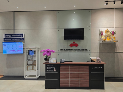 工場のロビーにモニターを設置し、リアルタイムで電力発電量や使用量が把握可能です。