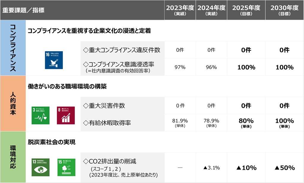社是・ビジョン・年度方針をもとに「コンプライアンス」「人的資本」「環境対応」の各分野から、当社グループが特に取り組むべき課題を抽出し、KPIとして目標を設定いたしました。